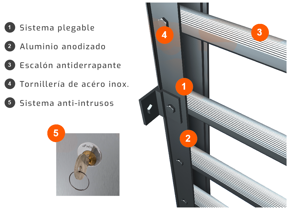 La escalera desplegable Escalmex esta construida en aluminio con tratamiento especial de anodizado contra la corrosión.